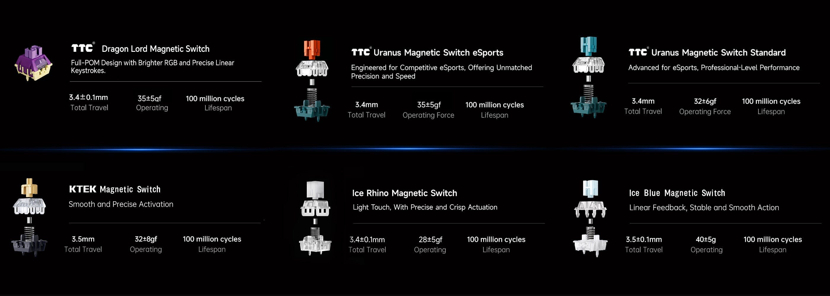 | Switch | Ice Blue Magnetic Switch | KTEK Magnetic Switch | Ice Rhino Magnetic Switch | Uranus Magnetic Switch Standard | Uranus Magnetic Switch eSports | TTC Dragon Lord Magnetic Switch | |